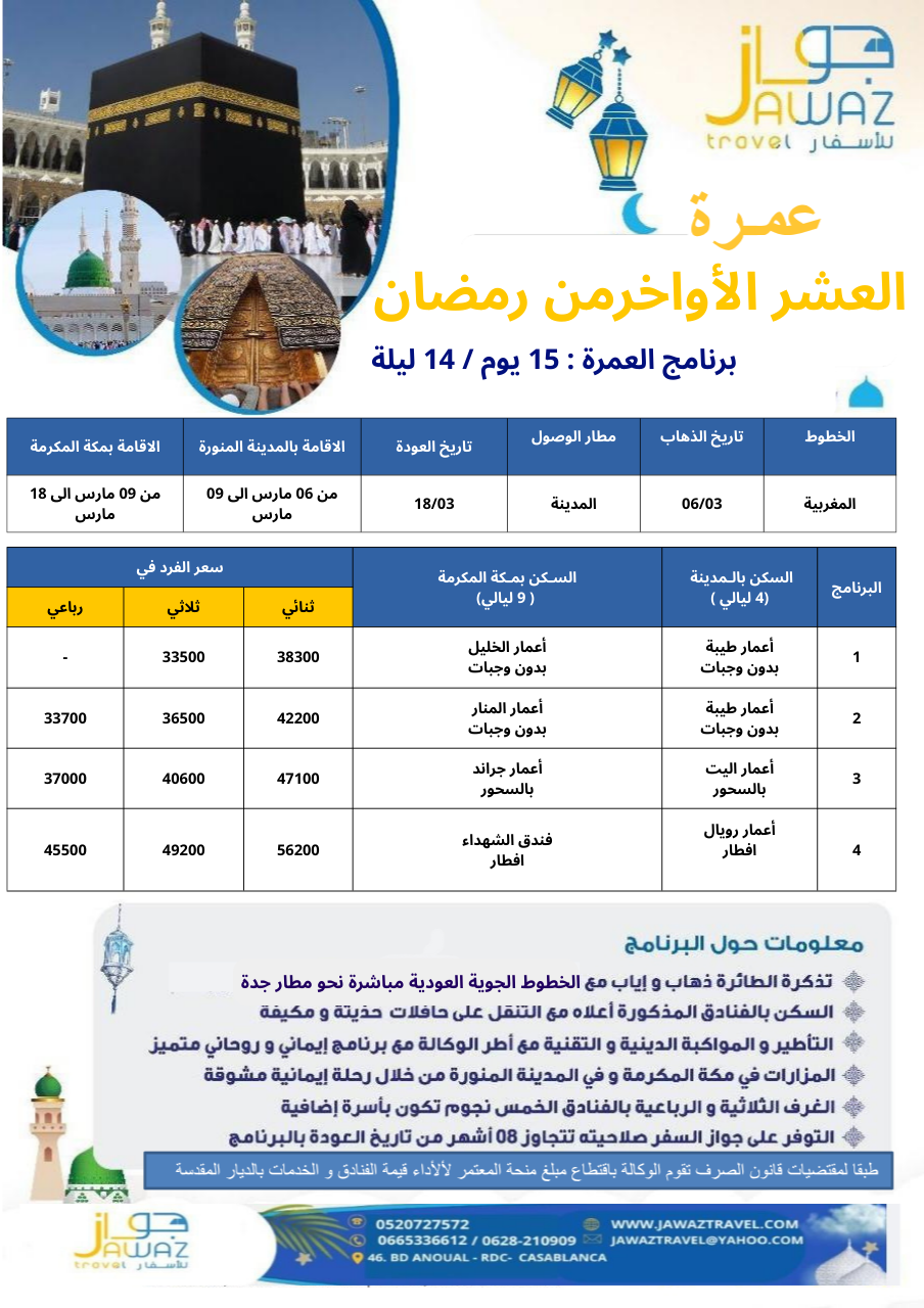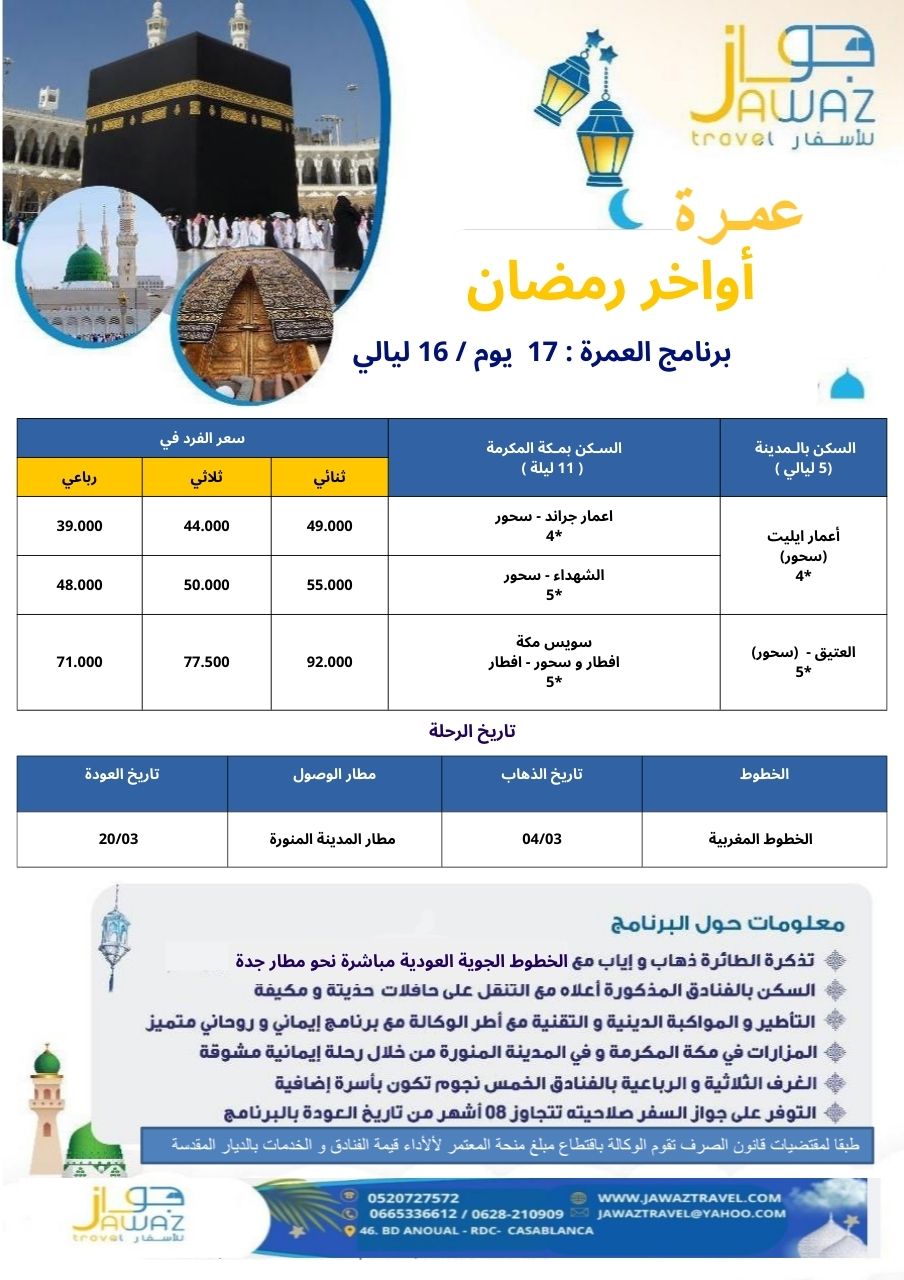 Jawaz Travel est une agence de voyage basée à Casablanca, spécialisée dans l’Omra, la billetterie d’avion, les voyages organisés et les réservations d’hôtels.